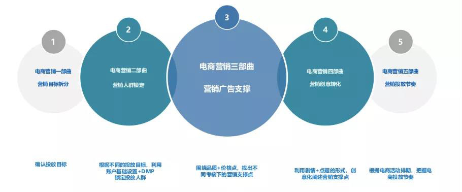 通过营销目标拆分、营销人群锁定、营销广告支撑、营销创意转化和营销投放节奏,汇集成电商营销五部曲,从而有效的通过数据分析和精准投放为广告主完成传播和销量的双向回报。