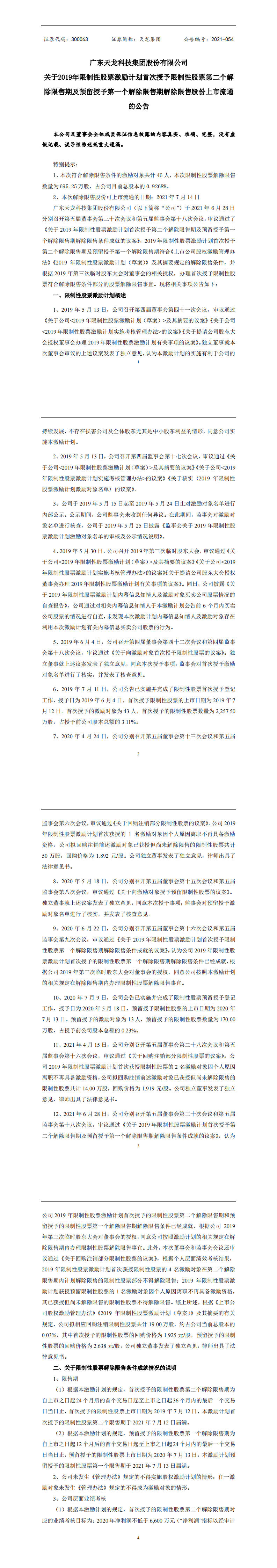 关于2019年限制性股票激励计划首次授予限制性股票第二个解除限售期及预留授予第一个解除限售期解除限售股份上市流通的公告