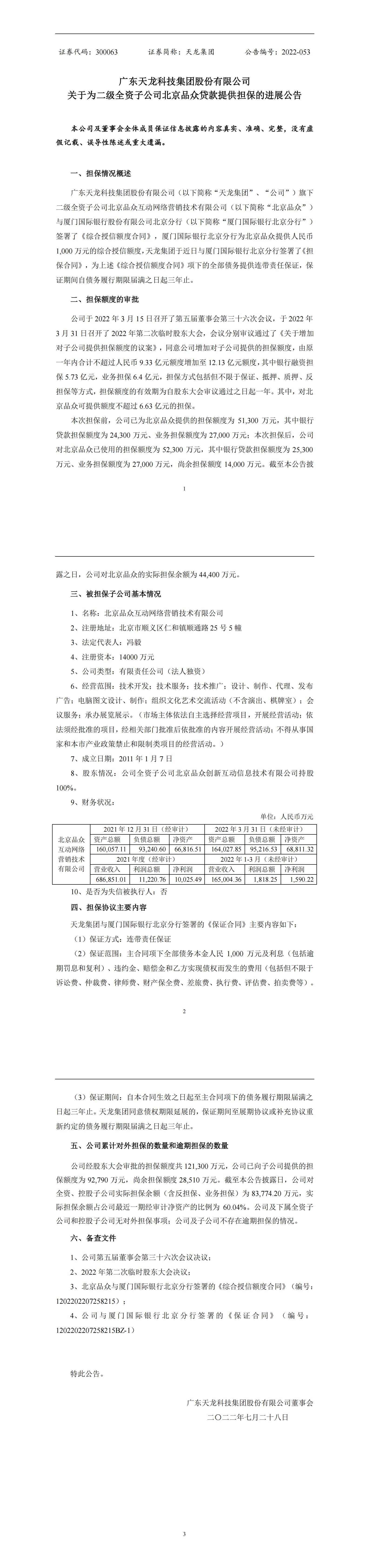 关于为二级全资子公司北京品众贷款提供担保的进展公告