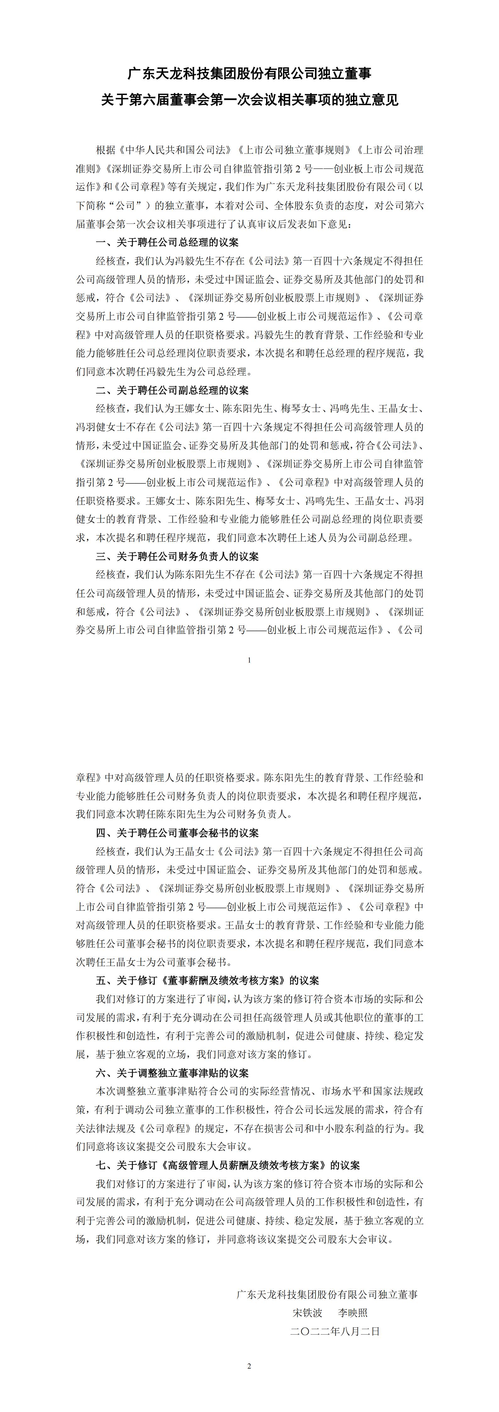 独立董事关于公司第六届董事会第一次会议相关事项的独立意见