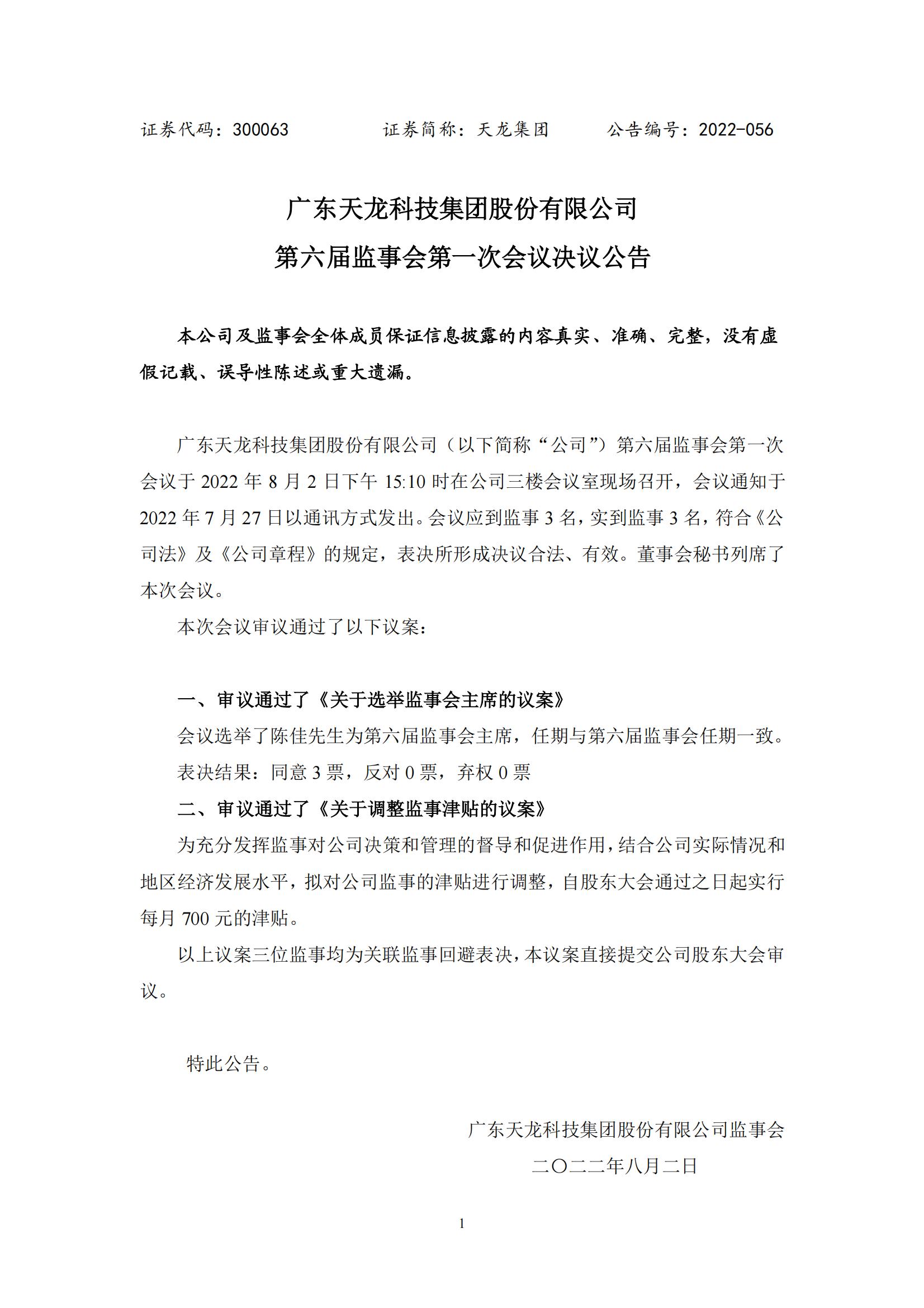 第六届监事会第一次会议决议公告