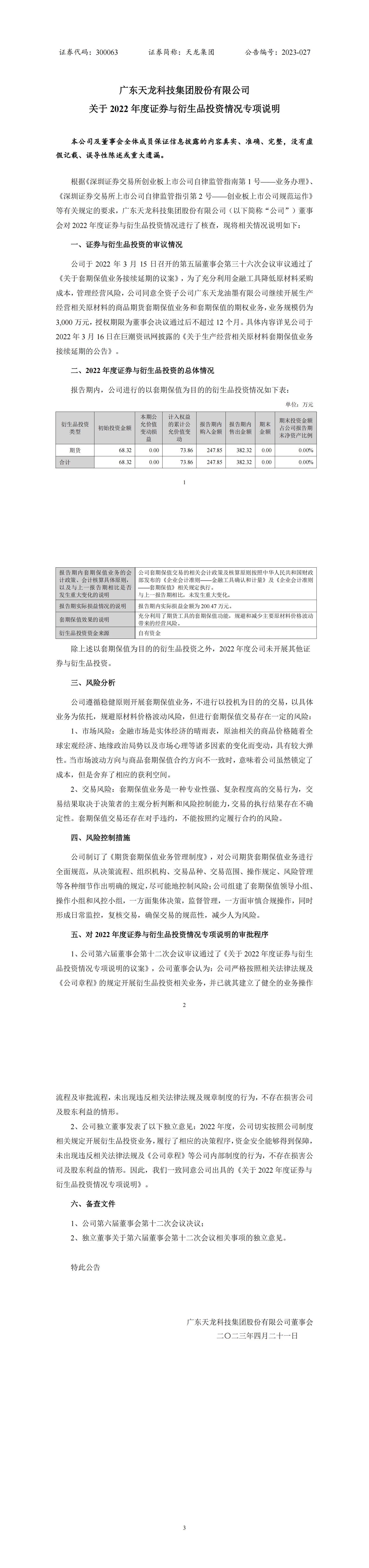 关于2022年度证券与衍生品投资情况专项说明的公告