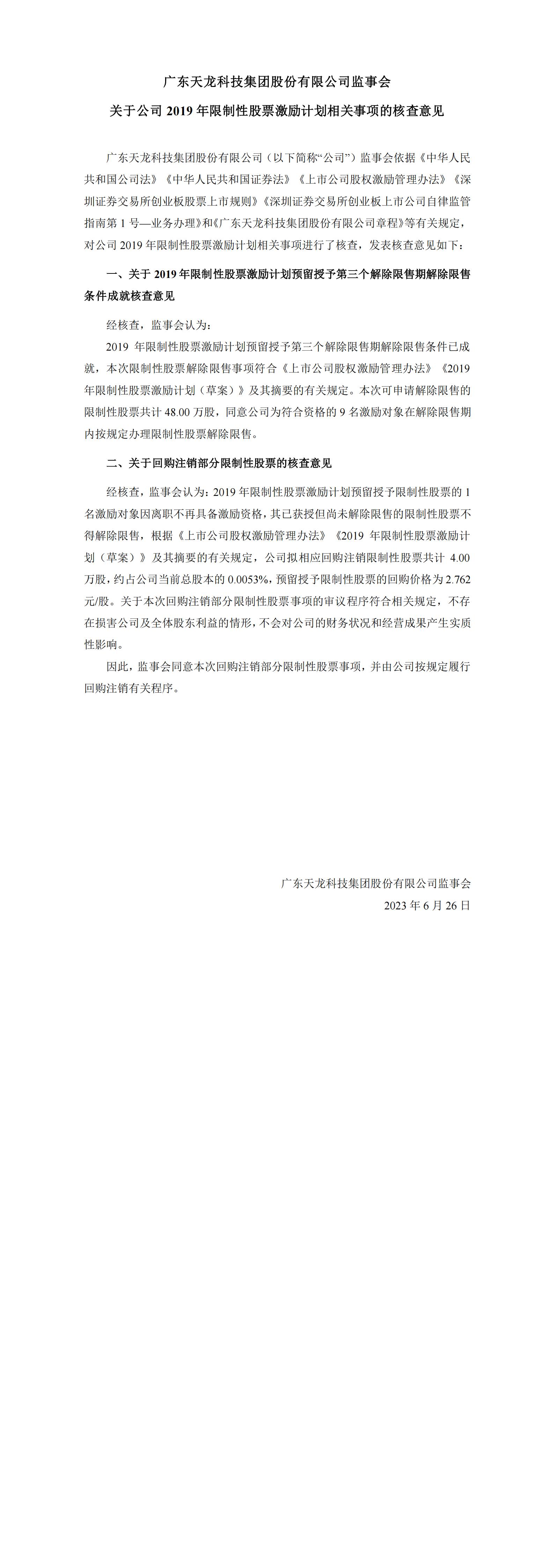 监事会关于公司2019年限制性股票激励计划相关事项的核查意见