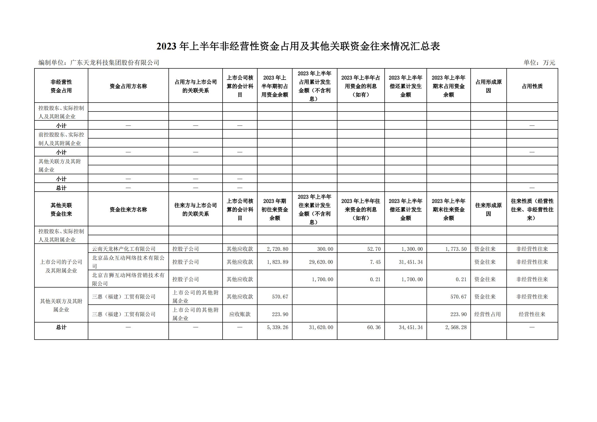 2023年上半年非经营性资金占用及其他关联资金往来情况汇总表
