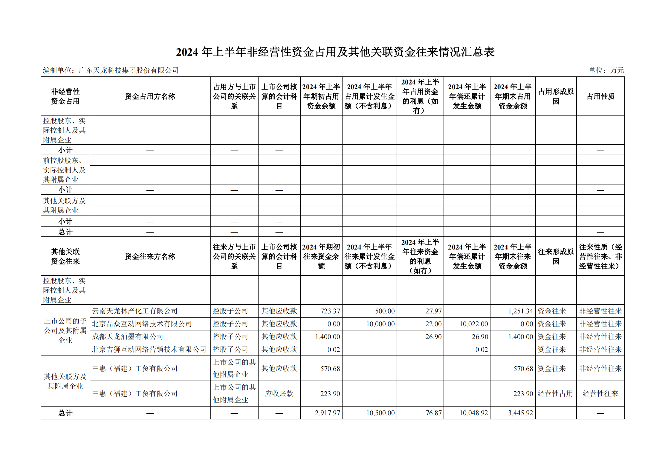 2024年上半年非经营性资金占用及其他关联资金往来情况汇总表