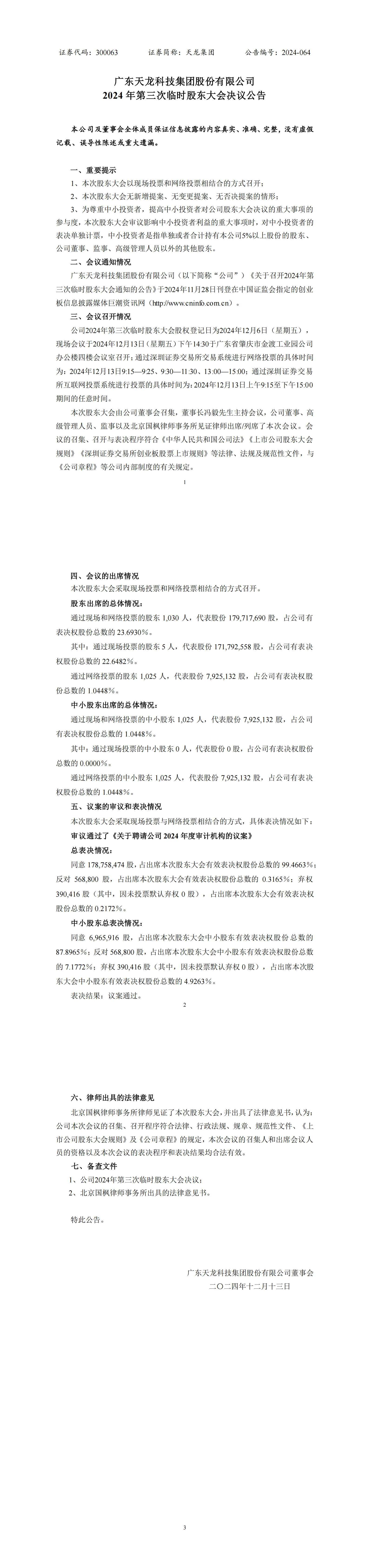 2024年第三次临时股东大会决议公告