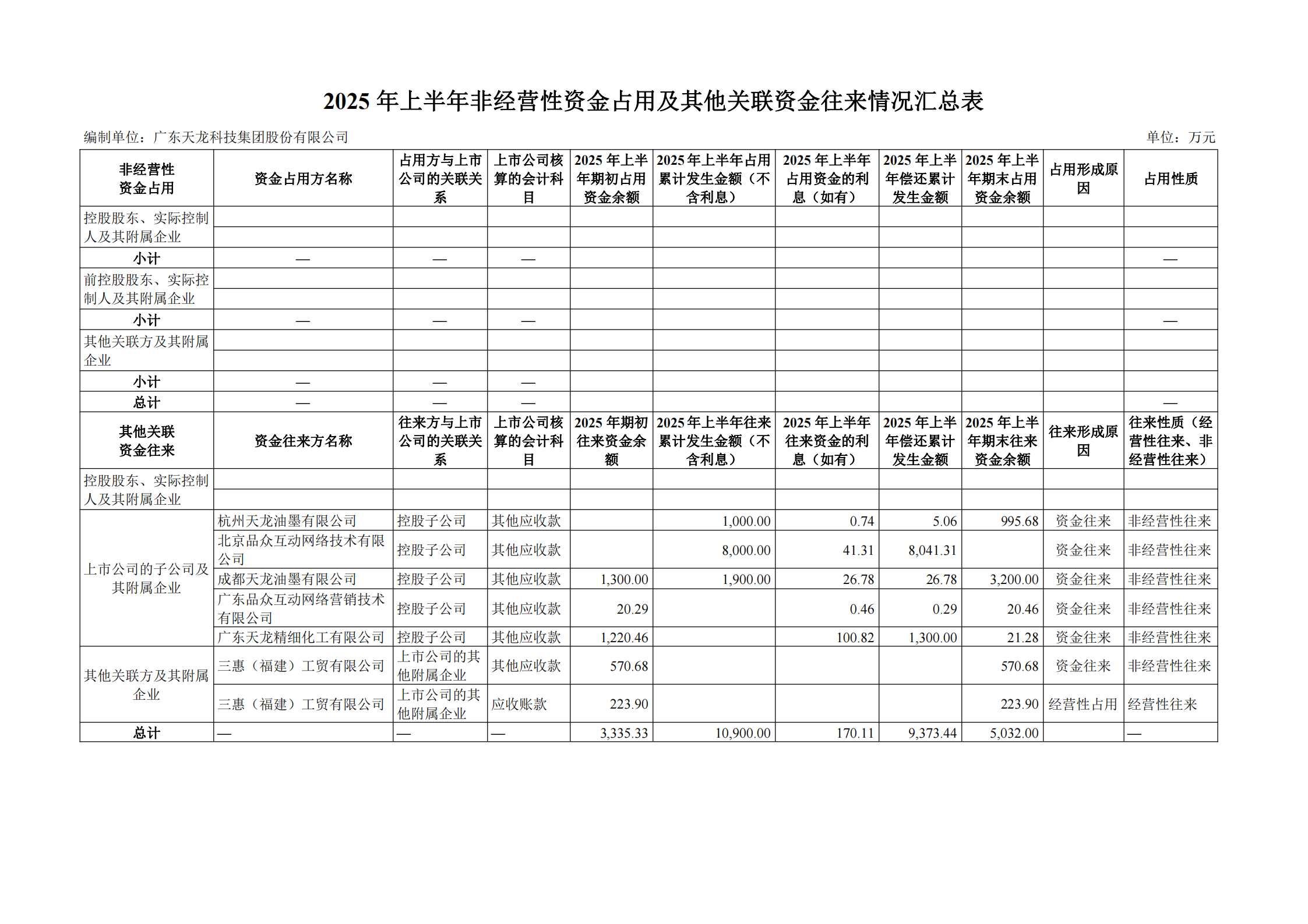 2025年上半年非经营性资金占用及其他关联资金往来情况汇总表