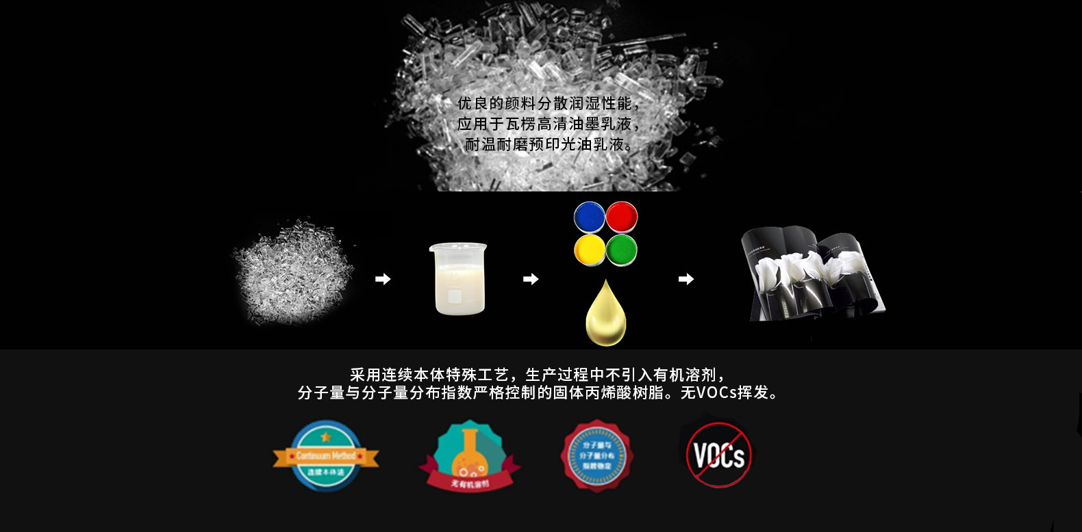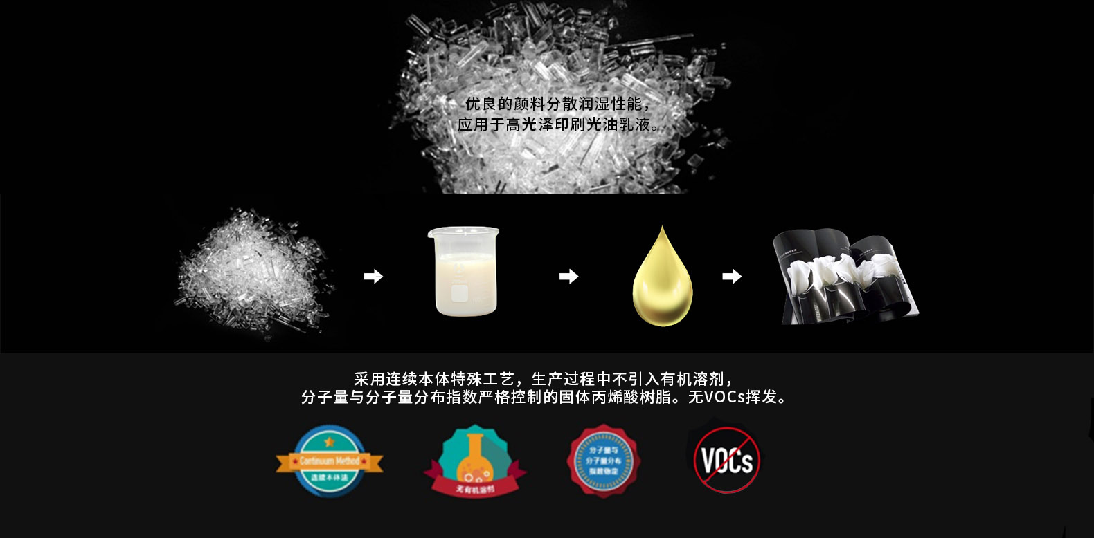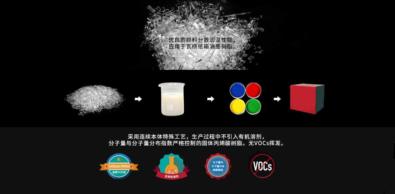 采用特殊工艺,生产过程中不引入有机溶剂,分子量与分子量分布指数严格控制的固体丙烯酸树脂,优良的颜料分散润湿性能,主要用于水性油墨色浆,水性上光油。