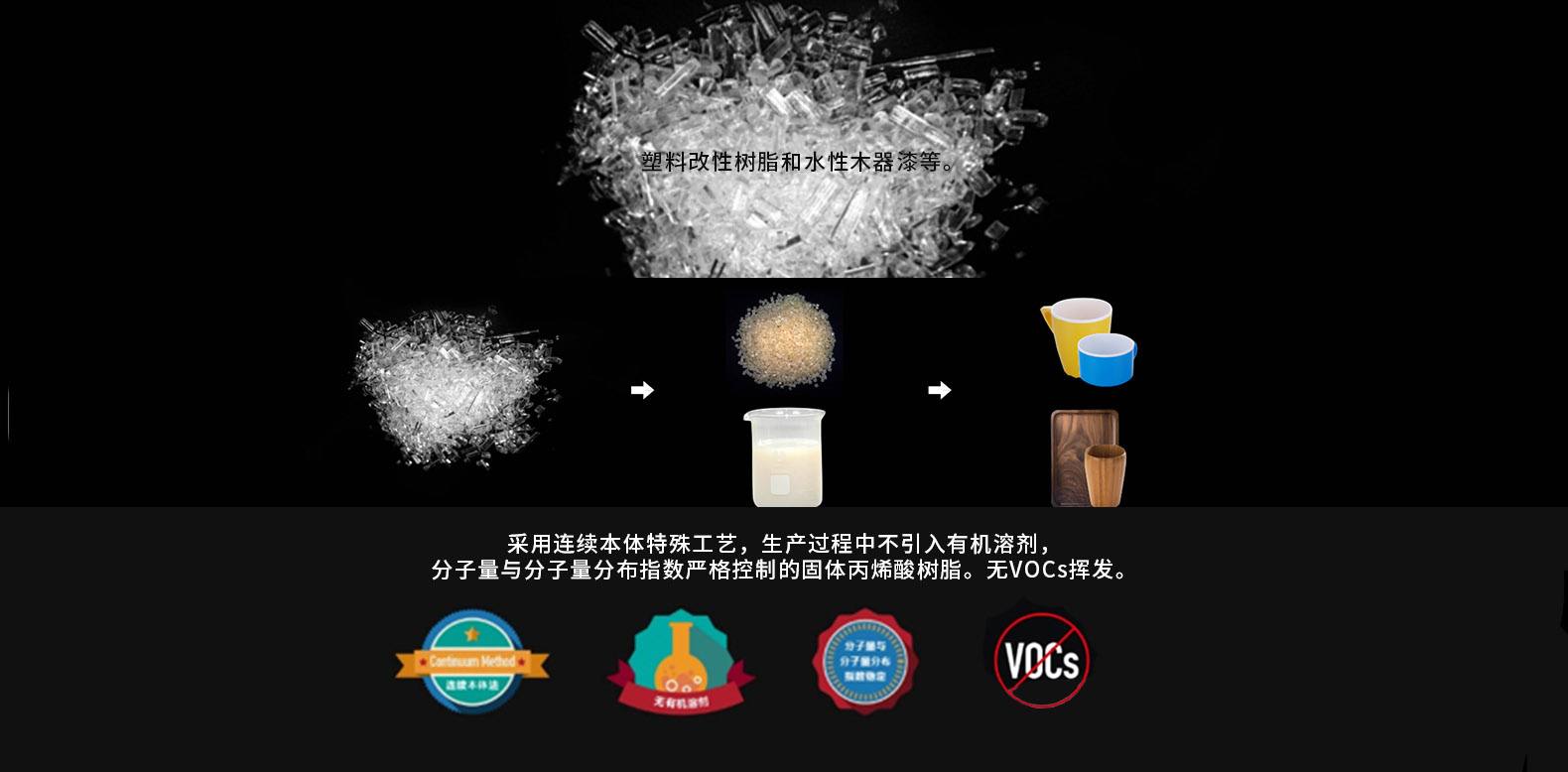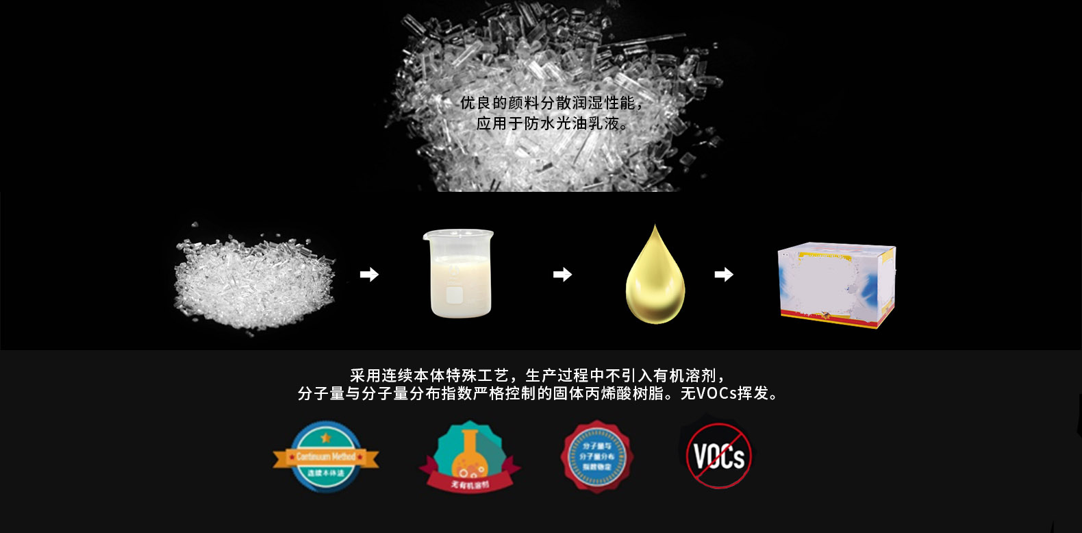 采用特殊工艺,生产过程中不引入有机溶剂,分子量与分子量分布指数严格控制的固体丙烯酸树脂,优良的颜料分散润湿性能,主要用于低固含量水性苯丙乳液的制备。
